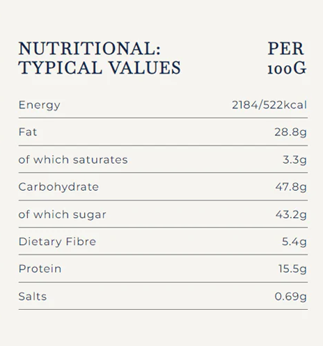 Peanuts (36%), Almonds (20%), Sugar, Blossom Honey (3%), Salt, Rice Flour, Yeast Extract Powder, Onion Powder, Cayenne, Garlic Powder, Lemon Juice Powder, Dried Yeast, Serrano Chilli Powder, Natural Flavourings, Natural Colour (Paprika), Rosemary Extract.
